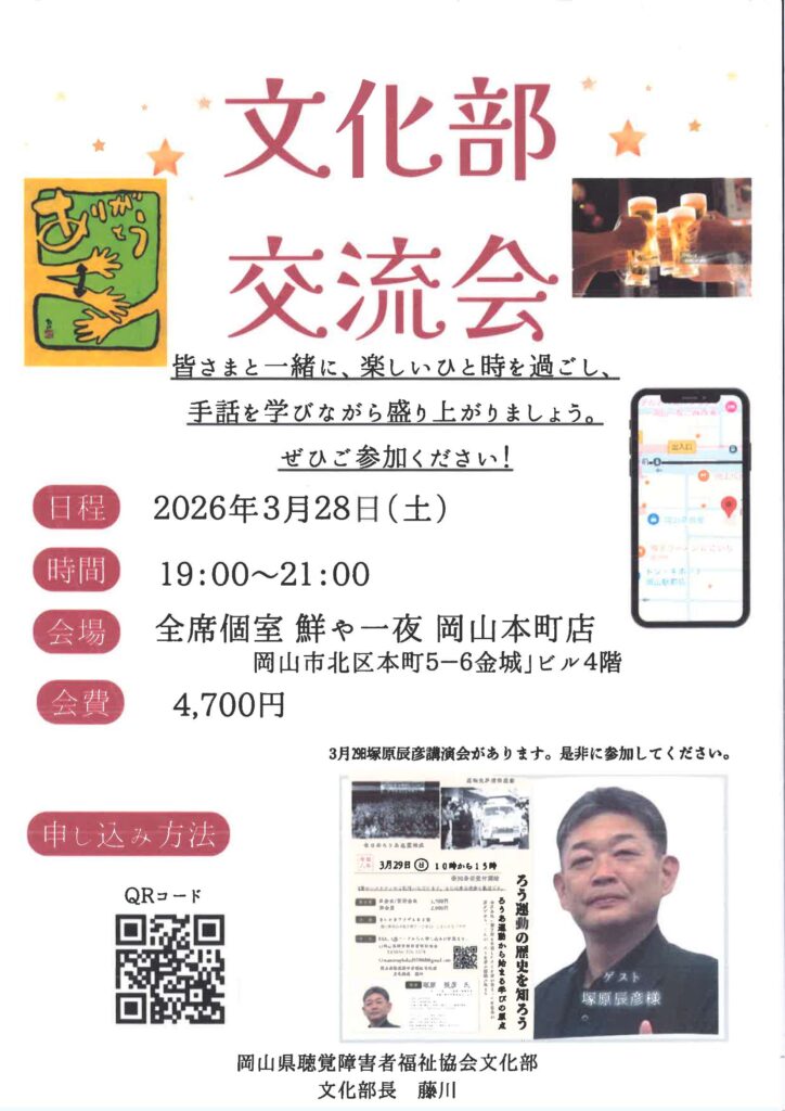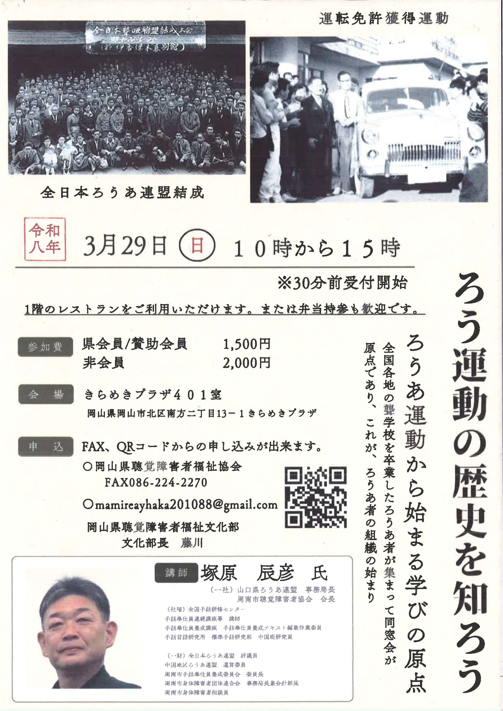 山口県ろうあ連盟事務局長 塚原辰彦氏が、これまでのろうあ運動を網羅した歴史を講演します。