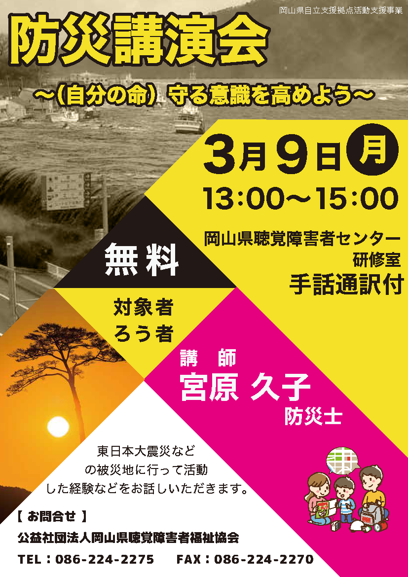 [お知らせ]防災講演会 3月9日(月) 2026.2.17 2026年3月9日(月)午後1時から岡山県自立支援拠点活動支援事業 防災講演会 が開催されます。 防災士の資格を持った、宮原久子氏が防災にまつわる知識などを講演されます。対象者:ろう者参加費:無料近年災害に対する危機感が強まってきている今、どのように命を守ればいいのか?防災知識を学んで身を守る備えをしよう! 詳細は下記チラシをご覧ください。